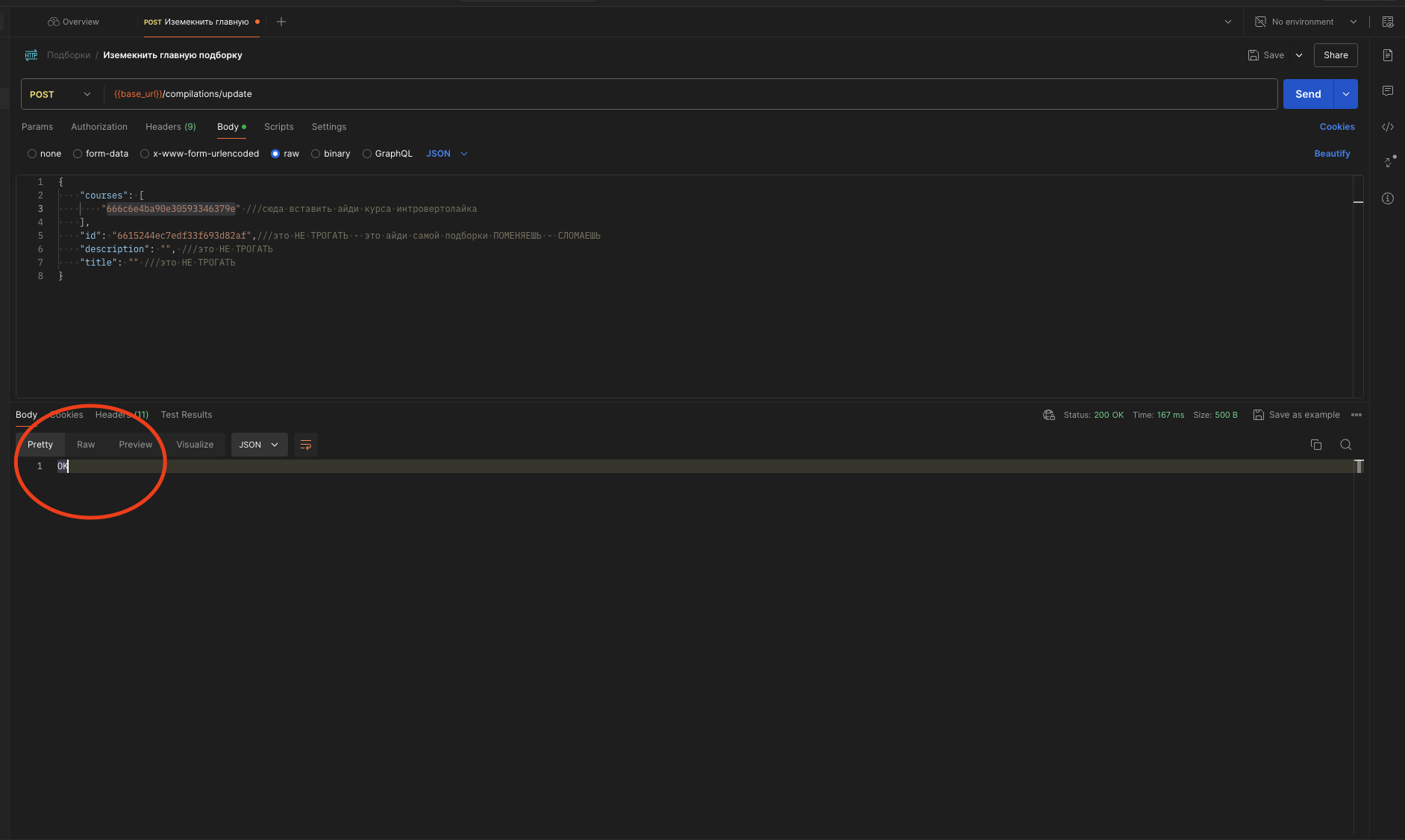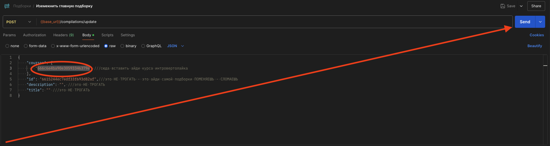 Берем, меняем айди в courses на курс который хотим поставить на главную, грестимся, молимся, жмуримся - нажимаем SEND - синяя кнопочка, пометил красной стрелочкой