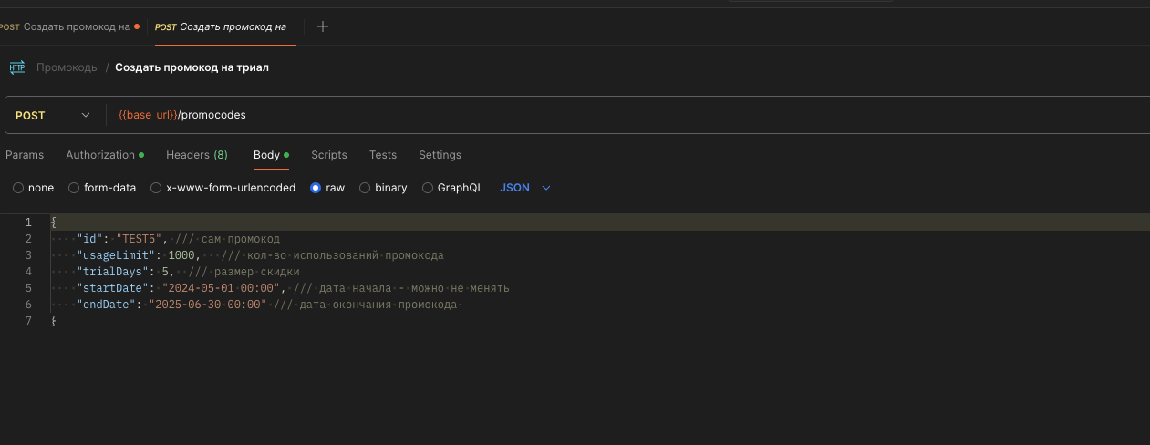 Создание промокода на ТРИАЛ